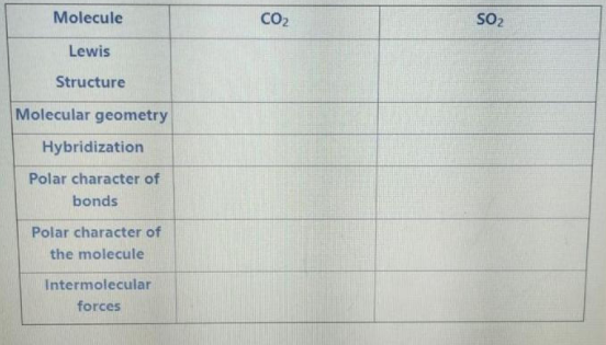 Molecule CO2 SO2 Lewis Structure Molecular geometry Hybridization Polar character of bonds Polar character of the molecule Intermolecular forces