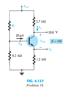 > Given the information provided in Fig. 4.126, determine: a. IC. b. VE. c. VB. d. R1.