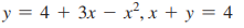> use a graphing calculator to graph the region R bounded by the graphs of the indicated equations. Use approximation techniques to find intersection points correct to two decimal places. Describe R in set notation with double inequalities, and evaluate th