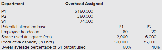 Great Ape Glassworks manufacturers glass used for the screens on smart phones. They have two producing departments, P1 and P2, and only one service department, S1. The company is able to track overhead to the various departments but wants to allocate the service department costs to the producing departments. However, they are not sure which of the multiple allocation bases should be selected. The data they collected appears in the tables below.