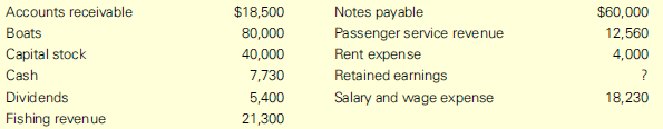 Accounts Receivable $18,500 Notes payable $60,000 Boats 80,000 Passenger service revenue Rent expense Retained earnings 12,560 Capital stock Cash 40,000 4,000 7,730 Dividends 5,400 Salary and wage expense 18,230 Fishing revenue 21,300