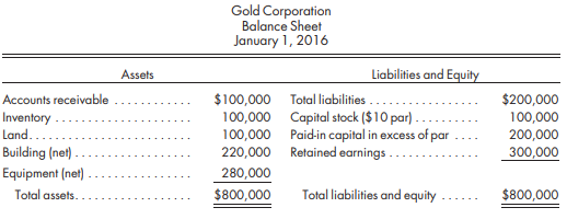 Gold Corporation Balance Sheet January 1, 2016 Assets Liabilities and Equity $100,000 Total liabilities .. 100,000 Capital stock ($10 par) . 100,000 Paid-in capital in excess of par 220,000 Retained earnings . $200,000 100,000 200,000 Accounts receivable Inventory . Land.. Building (net) . 300,000 Equipment (net) 280,000 $800,000 Total assets.. Total liabilities and equity $800,000