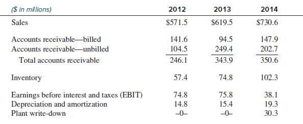 ($ in millions) 2012 2013 2014 Sales $571.5 $619.5 $730.6 Accounts receivable-billed 141.6 94.5 147.9 Accounts receivable-unbilled 104.5 249.4 202.7 Total accounts receivable 246.1 343.9 350.6 Inventory 57.4 74.8 102.3 Earnings before interest and taxes (EBIT) Depreciation and amortization Plant write-down 74.8 75.8 38.1 14.8 15.4 19.3 -0- -0- 30.3