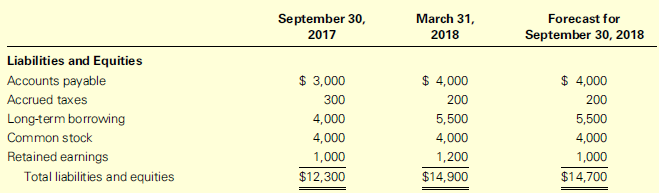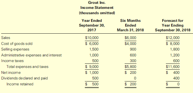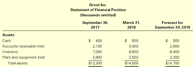 Grout Inc. Income Statement (thousands omitted) Year Ended Six Months Forecast for Year Ending September 30, 2018 September 30, Ended 2017 March 31, 2018 Sales $10,000 $6,000 $12,000 Cost of goods sold Selling expenses $ 6,000 $4,000 $ 8,000 1,500 900 1,800 Administrative expenses and interest 1,000 600 1,200 Income taxes 500 300 600 $ 9,000 $ 1,000 Total expenses and taxes $5,800 $11,600 Net income $ 200 400 Dividends declared and paid 500 400 Income retained $4 500 $ 200 $4 Grout Inc. Statement of Financial Position (thousands omitted) September 30, March 31, Forecast for 2017 2018 September 30, 2018 Assets Cash $ 400 $ 500 $ 500 Accounts receivable (net) 2,100 3,400 2,600 Inventory Plant and equipment (net) 7,000 8,500 8,400 2,800 2,500 3,200 Total assets $12,300 $14,900 $14,700 September 30, 2017 March 31, Forecast for 2018 September 30, 2018 Liabilities and Equities Accounts payable $ 3,000 $ 4,000 $ 4,000 Accrued taxes 300 200 200 Long-term borrowing Common stock 4,000 5,500 5,500 4,000 4,000 4,000 1,000 1,200 Retained earnings Total liabilities and equities 1,000 $12,300 $14,900 $14,700