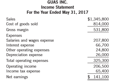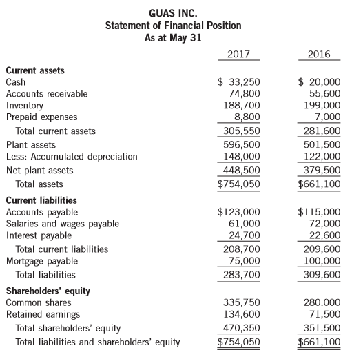 GUAS INC. Statement of Financial Position As at May 31 2017 2016 Current assets $ 33,250 74,800 188,700 8,800 305,550 $ 20,000 55,600 199,000 7,000 281,600 Cash Accounts receivable Inventory Prepaid expenses Total current assets Plant assets 596,500 148,000 448,500 $754,050 501,500 122,000 379,500 $661,100 Less: Accumulated depreciation Net plant assets Total assets Current liabilities Accounts payable Salaries and wages payable Interest payable $123,000 61,000 24,700 208,700 75,000 283,700 $115,000 72,000 22,600 Total current liabilities 209,600 Mortgage payable 100,000 Total liabilities 309,600 Shareholders' equity Common shares 335,750 134,600 470,350 $754,050 280,000 71,500 351,500 $661,100 Retained earnings Total shareholders' equity Total liabilities and shareholders' equity GUAS INC. Income Statement For the Year Ended May 31, 2017 $1,345,800 814,000 531,800 Sales Cost of goods sold Gross margin Expenses Salaries and wages expense Interest expense Other operating expenses depreciation expense Total operating expenses Operating income Income tax expense 207,800 66,700 24,800 26,000 325,300 206,500 65,400 $ 141,100 Net earnings