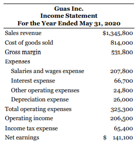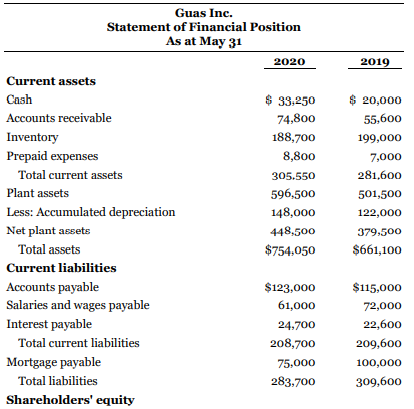 Guas Inc. Statement of Financial Position As at May 31 2020 2019 Current assets Cash $ 33:250 $ 20,000 Accounts receivable 74,800 55,600 Inventory 188,700 199,000 Prepaid expenses 8,800 7,000 Total current assets 305.550 281,600 Plant assets 596,500 501,500 Less: Accumulated depreciation 148,000 122,000 Net plant assets 448,500 379,500 Total assets $754,050 $661,100 Current liabilities Accounts payable Salaries and wages payable $123,000 $115,000 61,000 72,000 Interest payable 24,700 22,600 Total current liabilities 208,700 209,600 Mortgage payable 75,000 100,000 Total liabilities 283,700 309,600 Shareholders' equity Common shares 335:750 280,000 Retained earnings Total sharcholders' equity 134,600 71,500 470,350 351,500 Total liabilities and shareholders' equity $754,050 $661,100 Guas Inc. Income Statement For the Year Ended May 31, 2020 Sales revenue $1,345,800 Cost of goods sold Gross margin 814,000 531,800 Expenses Salaries and wages expense 207,800 Interest expense Other operating expenses 66,700 24,800 depreciation expense Total operating expenses Operating income 26,000 325.300 206,500 Income tax expense 65,400 Net earnings $ 141,100