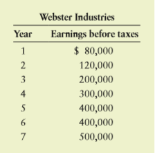 Webster Industries Year Earnings before taxes 1 $ 80,000 120,000 200,000 300,000 5 400,000 6. 400,000 7 500,000 2. 3.