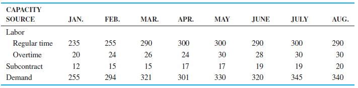 Haifa Instruments, an Israeli producer of portable kidney dialysis units and other medical products, develops an 8-month aggregate plan. Demand and capacity (in units) are forecast as shown in the table on this page. The cost of producing each dialysis unit is $1,000 on regular time, $1,300 on overtime, and $1,500 on a subcontract. Inventory carrying cost is $100 per unit per month. There is no beginning or ending inventory in stock.