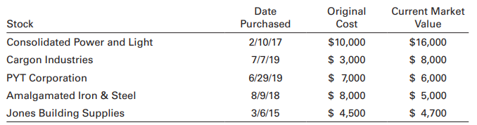 Hal and Terri Wilson had most of their funds invested in common stock in late 2019. The Wilsons didnât really do very much investment planning, and they had practically no background or understanding of how income taxes might affect their investment decisions. Their holdings consisted exclusively of common stocks, selected primarily on the advice of their stockbroker, Sid Nichols. Despite a relatively lackluster market, they did experience some nice capital gains, even though several of their holdings showed losses from their original purchase prices. A summary of their holdings on December 20, 2019, follows.