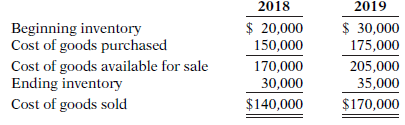 2018 2019 $ 20,000 150,000 $ 30,000 175,000 Beginning inventory Cost of goods purchased Cost of goods available for sale Ending inventory 170,000 30,000 205,000 35,000 $170,000 Cost of goods sold $140,000