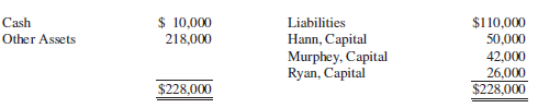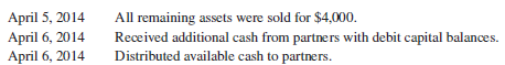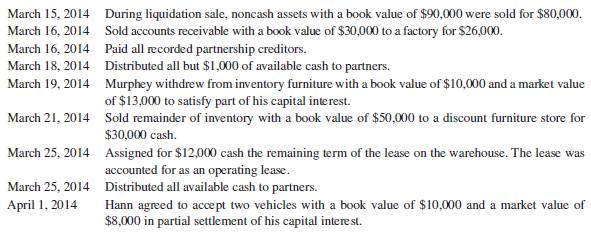 $ 10,000 218,000 $110,000 50,000 42,000 26,000 $228,000 Cash Liabilities Hann, Capital Murphey, Capital Ryan, Capital Other Assets $228,000 March 15, 2014 During liquidation sale, noncash assets with a book value of $90,000 were sold for $80,000. March 16, 2014 Sold accounts receivable with a book value of $30,000 to a factory for $26,000. March 16, 2014 Paid all recorded partnership creditors. March 18, 2014 Distributed all but $1,000 of available cash to partners. March 19, 2014 Murphey withdrew from inventory furniture with a book value of $10,000 and a market value of $13,000 to satisfy part of his capital interest. March 21, 2014 Sold remainder of inventory with a book value of $50,000 to a discount furniture store for $30,000 cash. March 25, 2014 Assigned for $12,000 cash the remaining term of the lease on the warehouse. The lease was accounted for as an operating lease. March 25, 2014 Distributed all available cash to partners. April 1, 2014 Hann agreed to accept two vehicles with a book value of $10,000 and a market value of $8,000 in partial settlement of his capital interest. April 5, 2014 April 6, 2014 April 6, 2014 All remaining assets were sold for $4,000. Received additional cash from partners with debit capital balances. Distributed available cash to partners.