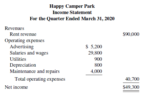 Happy Camper Park Income Statement For the Quarter Ended March 31, 2020 Revenues Rent revenue $90,000 Operating expenses Advertising Salaries and wages $ 5,200 29,800 Utilities 900 Depreciation Maintenance and repairs 800 4,000 Total operating expenses 40,700 Net income $49,300