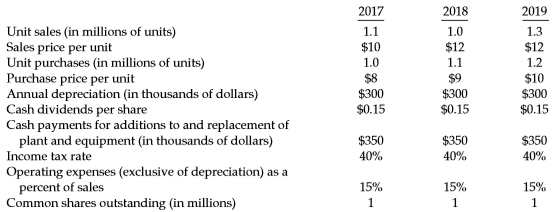 2017 2018 2019 Unit sales (in millions of units) Sales price per unit Unit purchases (in millions of units) Purchase price per unit Annual depreciation (in thousands of dollars) Cash dividends per share Cash payments for additions to and replacement of plant and equipment (in thousands of dollars) 1.1 1.0 1.3 $10 $12 $12 1.0 1.1 1.2 $8 $300 $0.15 $9 $10 $300 $300 $0.15 $0.15 $350 $350 40% $350 Income tax rate 40% 40% Operating expenses (exclusive of depreciation) as a percent of sales Common shares outstanding (in millions) 15% 15% 15% 1 1
