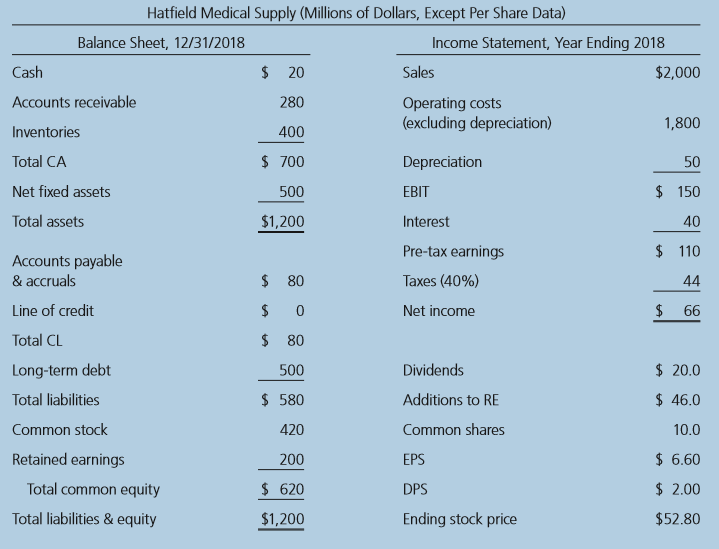 Hatfield Medical Supply (Millions of Dollars, Except Per Share Data) Balance Sheet, 12/31/2018 Income Statement, Year Ending 2018 Cash $ 20 Sales $2,000 Accounts receivable Operating costs (excluding depreciation) 280 1,800 Inventories 400 Total CA $ 700 depreciation 50 Net fixed assets 500 ЕBIT $ 150 Total assets $1,200 Interest 40 Pre-tax earnings $ 110 Accounts payable & accruals $ 80 Taxes (40%) 44 Line of credit $ Net income $ 66 Total CL $ 80 Long-term debt 500 Dividends $ 20.0 Total liabilities $ 580 Additions to RE $ 46.0 Common stock 420 Common shares 10.0 Retained earnings 200 EPS $ 6.60 Total common equity $ 620 DPS $ 2.00 Total liabilities & equity $1,200 Ending stock price $52.80 Hatfield Industry Hatfield Industry (Op. costs)/Sales 90.0% 88.0% (Total liability) / (Total assets) 48.3% 36.7% Depr./FA 10.0% 12.0% Times interest earned 3.8 8.9 Cash/Sales 1.0% 1.0% Return on assets (ROA) 5.5% 10.2% Receivables/Sales 14.0% 11.0% Profit margin (M) 3.30% 4.99% Inventories/Sales 20.0% 15.0% Sales/Assets 1.67 2.04 (Fixed assets)/Sales 25.0% 22.0% Assets/equity 1.94 1.58 (Acc. pay. & accr)/Sales 4.0% 4.0% Return on equity (ROE) 10.6% 16.1% Tax rate 40.0% 40.0% P/E ratio 8.0 16.0 ROIC 8.0% 12.5% NOPAT/Sales 4.5% 5.6% (Total op. capital)/Sales 56.0% 45.0%