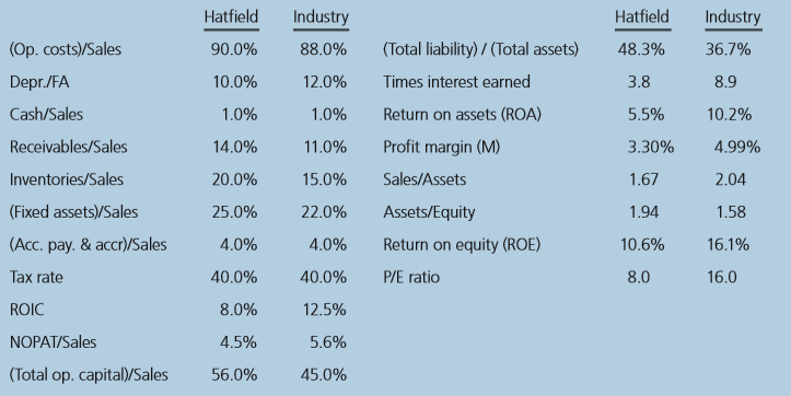 a. Using Hatfieldâs data and its industry averages, how well run would you say Hatfield appears to be compared to other firms in its industry? What are its primary strengths and weaknesses? Be specific in your answer, and point to various ratios that support your position. Also, use the DuPont equation (see Chapter 7) as one part of your analysis.