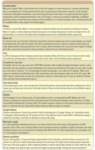 Acoustic guitar Why print a guitar? Well, a little-known fact is that the supplies of exotic woods are running considerably low, so manufacturers of Instruments need to start researching for alternative materials. Scott Summit, cofounder of Bespoke Innovations, says that the good news is that there is no gold standard for guitars compared to other stringed Instruments such as the violin, so they can be made of anything. In addition, guitarists prefer to have their own unique sound in addition to a customized guitar face, something that will be available with a truly original, 3D-printed guitar. Bikinis The N12 is named after Nylon 12, the material in which the bikini was 3D printed by Continuum Fashion. Nylon 12 makes an ideal swimsuit material because it is Innately waterproof. As well as being the first 3D printed bikini, it is also the first bikini that actually becomes more comfortable when it gets wet. Blonic ear To construct the ear, Princeton University researchers print the polymer gel onto an approximate ear shape and Implant calf cells onto the matrix. The silver nanoparticles fuse to create an antenna, which picks up radio signals before being transferred to the cochlea, which translates the sound into brain signals. Despite all of this, researchers have yet to draw up plans to attach the ear to the human head. Cars In 2010, Stratasys and Kor Ecologic teamed up to develop Urbee, the first car ever to have its entire body 3D printed by printing layers of material on top of each other until a finished product appeared. Car parts for Jay Leno Comedian and car nut Jay Leno had a 1907 White Steamer with a badly damaged feedwater heater, a part that bolts onto the cylinders. Using a NextEngine 3D scanner and Dimension 3D printer, he was able to whip up a new one in 33 hours. "It's an amazingly versatile technology," Leno said on his website. "My EcoJet supercar needed air-conditioning ducts. We used plastic parts we designed, right out of the 3D copler. We didn't have to make these scoops out of aluminum-plastic is what they use in a real car. And the finished ones look like factory production pleces." Chocolate heads Some people give roses, some people give 3D-printed jewelry, some people give their undying love. But In Japan, you can give your lover your chocolate head so they can bite into your brain as the ultimate expres- sion of love. Clothes Dutch designer Irts van Herpen was at Fashion Week In Parts, accompanied by MIT Media Lab's Neri Oxman, to showcase a dress that was fabricated using 3D printing technology. It was printed on an Objet Connex500 multimaterial 3D printer. Most 3D printers require creations to be printed using only one type of fabric or material, but the Connex500 allows mixing of different types of material. Google Glasses Chinese entrepreneur Sunny Gao printed a fully functioning pair of Google Glasses at a hackathon event In Shanghal. Unfortunately, the 3D printed version of the glasses doesn't boast Wi-Fi or Bluetooth support, unlike the real thing-but they are identical in every other way. Meat (yes, meat) U.S. start-up Modern Meadow belleves it can make artificial raw meat using a 3D bioprinter, the BBC reported. Peter Thiel, one of Silicon Valley's most prominent venture capitalists, PayPal cofounder, and early Facebook Investor, has just backed the company with $350,000. The team reportedly has a prototype, but It's "not ready for consumption." Robotic prosthetic Easton La Chappelle, a 17-year-old high school student from Colorado, used free online resources for 3D printers to construct a fully functional prosthetic arm and hand. The high school student found Inspiration from one of his past projects, which Involved building a robotic hand made entirely of LEGOs when he was 14. His creation was able to open and close its fingers using two things: fishing line and servomotors.²