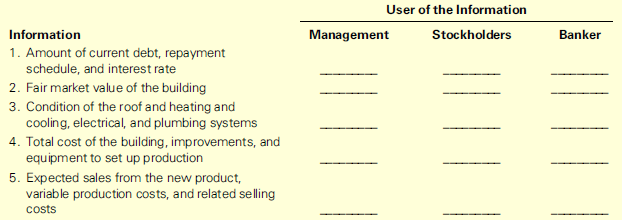 User of the Information Information Management Stockholders Banker 1. Amount of current debt, repayment schedule, and interest rate 2. Fair market value of the building 3. Condition of the roof and heating and cooling, electrical, and plumbing systems 4. Total cost of the building, improvements, and equipment to set up production 5. Expected sales from the new product, variable production costs, and related selling costs