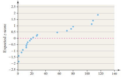 > Use the results in the table to (a) draw a normal plot, (b) determine the linear correlation between the observed values and expected z-scores, (c) determine the critical value in Table VI to assess the normality of the data.