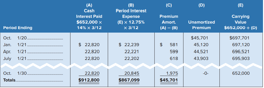 Henderson Armour Inc. issued a $652,000, 14% 10-year bond on October 1, 2020, for cash of $697,701. Interest is to be paid quarterly. The annual market rate of interest is 12.75%. Assume a year-end of February 28. A partial amortization schedule, using the effective interest method, is shown below.