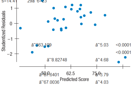 Here a plot of the Studentized residuals against the predicted values for the regression model found in Exercise 14 :