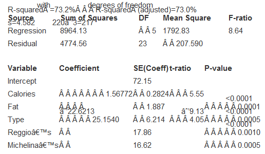 > In Exercise 25 of Chapter 9 , we considered a multiple regression model for predicting calories in breakfast cereals. The regression looked like this: Dependent variable is: Calories R-squared =38.4% R-squared (adjusted)=35.9% s=15.60 with 774=73 degrees