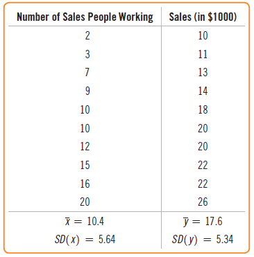 > For the bookstore sales data in Exercise 1, the correlation of number of sales people and sales is 0.965. a) If the number of people working is 2 standard deviations above the mean, how many standard deviations above or below the mean do you expect sales