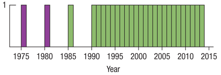 Here are the same histograms as in Exercise 7. However, the two groups of fatalities have been highlighted, and the corresponding bars in the Year histogram are also highlighted.