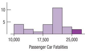 > Here are two histograms showing the annual number of traffic fatalities in passenger cars. (NHTSA) One plots the years, and the other plots the fatalities. 1. There are gaps in the histogram for Year. What do they indicate? 2. Why are all the bars in the