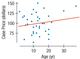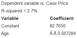 Here are the scatterplot and regression analysis for Case Prices of 36 wines from vineyards in the Finger Lakes region of New York State and the Ages of the vineyards. (Data in Vineyards full)