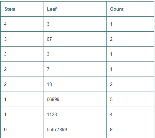 Here is a stem-and-leaf display showing profits (in $M) for 30 of the 500 largest global corporations (as measured by revenue). The stems are split; each stem represents a span of 5000 ($M), from a profit of 43,000 ($M) to a loss of 7000 ($M). Use the stem-and-leaf to answer the questions.