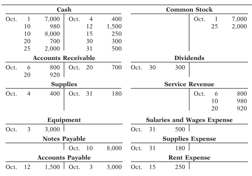 Cash Common Stock Oct. 1 7,000 980 Oct. 4 400 Oct. 1 7,000 10 12 1,500 25 2,000 10 8,000 15 250 20 700 30 300 25 2,000 31 500 Accounts Receivable Dividends Oct. 800 Oct. 20 700 Oct. 30 300 20 920 Supplies Service Revenue Oct. 4 400 Oct. 31 180 Oct. 6 800 10 980 20 920 Equipment Salaries and Wages Expense Oct. 3 3,000 Oct. 31 500 Notes Payable Supplies Expense 180 | Oct. 10 8,000 Oct. 31 Accounts Payable Rent Expense Oct. 12 1,500 | Oct. 3 3,000 Ot. 15 250