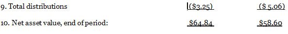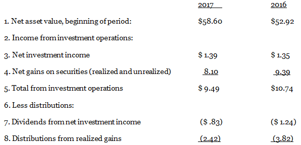 2017 2016 1. Net asset value, beginning of period: $58.60 $52.92 2. Income frominvestment operations: 3. Net investment income $ 1.39 $ 1.35 4. Net gains on securities (realized andunrealized) 8.10 9.39 5. Total from investment operations $ 9.49 $10.74 6. Less distributions: 7. Dividends from net investment income ($.83) ($ 1.24) 8. Distributions from realized gains (2.42) (3.82) 9. Total distributions |($3.25) ($ 5.06) 10. Net asset value, end of period: $64.84 $58.60