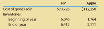 Hewlett Packard Company (HP ) and Apple Inc. are both developers and marketers of computer equipment and peripherals. However, the two companies follow different manufacturing strategies. HP maintains a significant portion of its own manufacturing capabilities, while Apple outsources manufacturing to other companies. The following financial statement information is provided for both companies for a recent year (in millions):