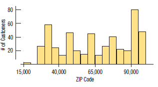 Holes-R-Us, an Internet company that sells piercing jewelry, keeps transaction records on its sales. At a recent sales meeting, one of the staff presented the following histogram and summary statistics of the ZIP codes of the last 500 customers, so that the staff might understand where sales are coming from. Comment on the usefulness and appropriateness of this display.