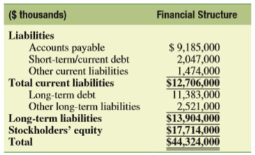 ($ thousands) Financial Structure Liabilities $ 9,185,000 2,047,000 1,474,000 $12,706,000 11,383,000 2,521,000 $13,904,000 $17,714,000 $44,324,000 Accounts payable Short-term/current debt Other current liabilities Total current liabilities Long-term debt Other long-term liabilities Long-term liabilities Stockholders’ equity Total