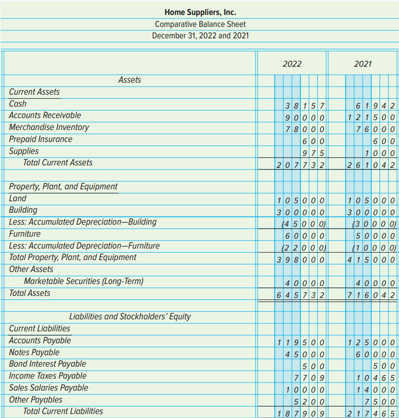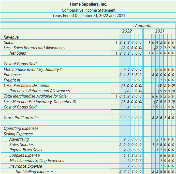 Home Suppliers, Inc. sells a variety of consumer products. Its comparative income statement and balance sheet for the years 2022 and 2021 are presented on the following pages. The Retained Earnings balance on January 1, 2021, was $188,442. Also, Preferred Stockholder cash dividends of $5,000 were paid each year as was $50,000 in dividends paid to Common Stockholders each year.