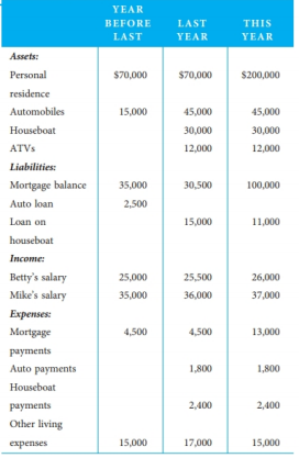 YEAR BEFORE LAST THIS LAST YEAR YEAR Assets: Personal $70,000 $70,000 $200,000 residence Automobiles 15,000 45,000 45,000 Houseboat 30,000 30,000 ATVS 12,000 12,000 Liabilities: Mortgage balance 35,000 30,500 100,000 Auto loan 2,500 Loan on 15,000 11,000 houseboat Income: Betty's salary 25,000 25,500 26,000 Mike's salary 35,000 36,000 37,000 Еxpenses Mortgage 4,500 4,500 13,000 рауments Auto payments 1,800 1,800 Houseboat раyments 2,400 2,400 Other living еxpenses 15,000 17,000 15,000
