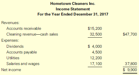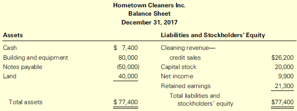 Hometown Cleaners Inc. Income Statement For the Year Ended December 31, 2017 Revenues: Accounts receivable $15,200 Cleaning revenue-cash sales 32,500 $47,700 Expenses: $ 4,000 Dividends Accounts payable 4,500 Utilities 12,200 Salaries and wages 17,100 37,800 Net income $ 9,900 Hometown Cleaners Inc. Balance Sheet December 31, 2017 Assets Liabilities and Stockholders' Equity Cash $ 7,400 Cleaning revenue- Building and equipment 80,000 credit sales $26,200 Notes payable (50,000) Capital stock 20,000 Land 40,000 Net income 9,900 Retained earnings 21,300 Total liabilities and Total assets $ 77,400 Stockholders' Equity $77,400