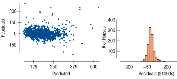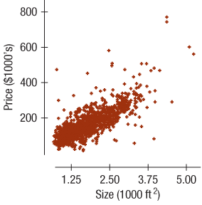 How does the price of a house depend on its size? Data from Saratoga, New York, on 1063 randomly selected houses that had been sold include data on price ($1000s) and size (1000 ft2), producing the following graphs and computer output: