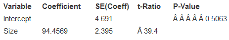 > Exercise 24 shows computer output examining the association between the sizes of houses and their sale prices. 1. Check the assumptions and conditions for inference. 2. Find a 95% confidence interval for the slope and interpret it in context.