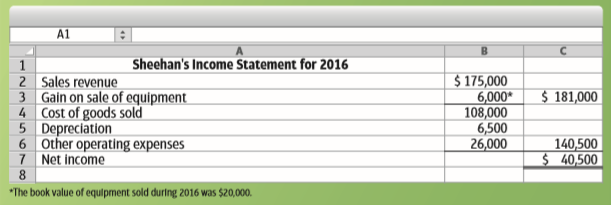 > Sheehan’s net cash provided by operating activities during 2016 was a. $55,000. b. $58,000. c. $61,000. d. $52,000. A1 Sheehan's Income Statement for 2016 1 2 Sales revenue 3 Gain on sale of equipment 4 Cost of goods sold 5 Depr