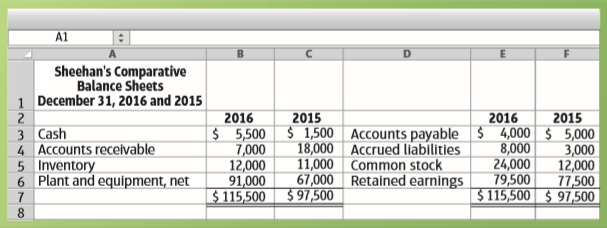 A1 Sheehan's Income Statement for 2016 1 2 Sales revenue 3 Gain on sale of equipment 4 Cost of goods sold 5 Depreciation 6 Other operating expenses 7 Net income 8 $ 175,000 6,000* 108,000 6,500 26,000 $ 181,000 140,500 $ 40,500 *The book value of equipment sold during 2016 was $20,000. A1 Sheehan's Comparative Balance Sheets 1 December 31, 2016 and 2015 2016 2015 2016 2015 3 Cash 4 Accounts receivable 5 Inventory 6 Plant and equipment, net 7 $ 5,500 $ 1,500 Accounts payable $ 4,000 $ 5,000 18,000 Accrued liabilities 11,000 Common stock 67,000 Retained earnings 8,000 24,000 7,000 12,000 91,000 $ 115,500 $ 97,500 3,000 12,000 79,500 77,500 $ 115,500 $ 97,500