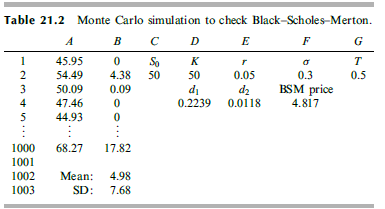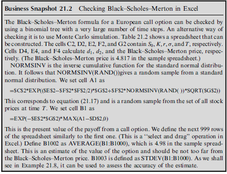 Business Snapshot 21.2 Checking Black-Scholes-Merton in Excel The Black-Scholes-Merton formula for a European call option can be checked by using a binomial tree with a very large number of time steps. An alternative way of checking it is to use Monte Carlo simulation. Table 21.2 shows a spreadsheet that can be constructed. The cells C2, D2, E2, F2, and G2 contain So, K,r,0, and T, respectively. Cells D4, E4, and F4 calculate dı, d2, and the Black-Scholes-Merton price, respec- tively. (The Black-Scholes-Merton price is 4.817 in the sample spreadsheet.) NORMSINV is the inverse cumulative function for the standard normal distribu- tion. It follows that NORMSINV(RAND())gives a random sample from a standard normal distribution. We set cell Al as =SCS2*EXP(SES2-SFS2*SF$2/2)*SGS2+$F$2*NO RMSINV(RAND)*SQRT($GS2)) This corresponds to equation (21.17) and is a random sample from the set of all stock prices at time T. We set cell B1 as =EXP(-SES2*SGS2)* MAX(A1-SD$2,0) This is the present value of the payoff from a call option. We define the next 999 rows of the spreadsheet similarly to the first one. (This is a "select and drag“ operation in Excel.) Define B1002 as AVERAGE(B1:B1000), which is 4.98 in the sample spread- sheet. This is an estimate of the value of the option and should be not too far from the Black-Scholes-Merton price. B1003 is defined as STDEV(B1:B1000). As we shall see in Example 21.8, it can be used to assess the accuracy of the estimate. Table 21.2 Monte Carlo simulation to check Black-Scholes-Merton. в с A B D E F G 1 45.95 So K T 2 54.49 4.38 50 50 0.05 0.3 0.5 3 50.09 0.09 di 0.2239 d2 0.0118 BSM price 47.46 4.817 5 44.93 1000 68.27 17.82 1001 1002 Mean: 4.98 1003 SD: 7.68