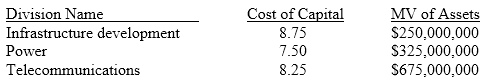 MV of Assets Division Name Infrastructure development Cost of Capital 8.75 $250,000,000 S325,000,000 S675,000,000 Power 7.50 Telecommunications 8.25
