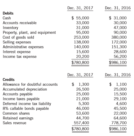 Dec. 31, 2017 Dec. 31, 2016 Debits $ 55,000 33,000 31,000 95,000 253,000 138,000 140,000 15,600 20,200 $ 31,000 30,000 47,000 90,000 380,000 172,000 151,300 28,600 56,200 Cash Accounts receivable Inventory Property, plant, and equipment Cost of goods sold Selling expenses Administrative expenses Interest expense Income tax expense $780,800 $986,100 Dec. 31, 2017 Dec. 31, 2016 Credits $ 1,300 26,500 25,000 21,000 5,300 46,000 53,600 44,700 557,400 $ 1,100 25,000 15,500 29,100 4,600 45,500 22,000 64,600 778,700 Allowance for doubtful accounts Accumulated depreciation Accounts payable Income taxes payable Deferred income tax liability 8% callable bonds payable Common shares Retained earnings Sales revenue $780,800 $986,100
