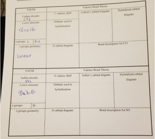 Valence Bond Theory VSEPR Hybridized orbital diagram Cvalence shell Carbon's orbital diagram Carton dionide Lewis structure orbitals used in hybridization egroups: 2 Ip:0 egroups geometry: O orbital diagram Bond description for CO Linear VSEPR Valence Bond Theory Sulfur dioxide S vakence shell Sulfur's orbital diagram Hybridized orbital diagram Lewis structure orbitals used in hybridization Öz 5:ö: e groups: Ip: O orbital diagram Bond description for SO egroups geometry: