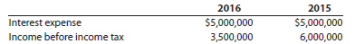 2016 2015 Interest expense $5,000,000 $5,000,000 Income before income tax 3,500,000 6,000,000