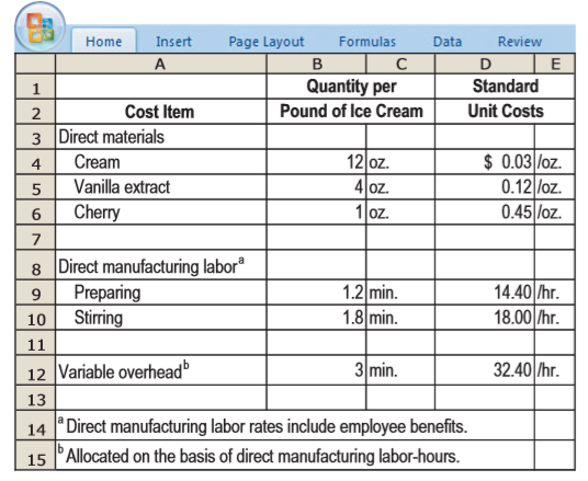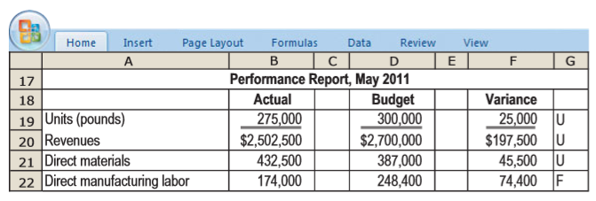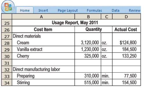 Home Insert Page Layout Formulas Data Review A D Standard E 1 Quantity per Cost Item Pound of Ice Cream Unit Costs 3 Direct materials $ 0.03 loz. 0.12 loz. 0.45 loz. 4 Cream 12 oz. 4 oz. 1 oz. 5 Vanilla extract Cherry 7 8 Direct manufacturing labor Preparing Stirring 1.2 min. 1.8 min. 14.40 hr. 18.00 /hr. 9 10 11 12 Variable overhead 32.40 /hr. 3 min. 13 14 Direct manufacturing labor rates include employee benefits. 15 PAllocated on the basis of direct manufacturing labor-hours. Home Insert Page Layout Formulas Data Review View A D F G 17 Performance Report, May 2011 Actual Variance Budget 300,000 $2,700,000 387,000 18 19 Units (pounds) 20 Revenues 21 Direct materials 22 Direct manufacturing labor 275,000 $2,502,500 432,500 174,000 25,000 U $197,500 U 45,500 U F 248,400 74,400 Home Insert Page Layout Formulas Data Review A C в Usage Report, May 2011 Quantity 25 26 Cost Item Actual Cost 27 Direct materials 3,120,000 oz. 1,230,000 |oz. 325,000 oz. 28 Cream $124,800 29 Vanilla extract 184,500 30 Cherry 133,250 31 32 Direct manufacturing labor Preparing Stirring 310,000 min. 515,000 min. 33 77,500 34 154,500