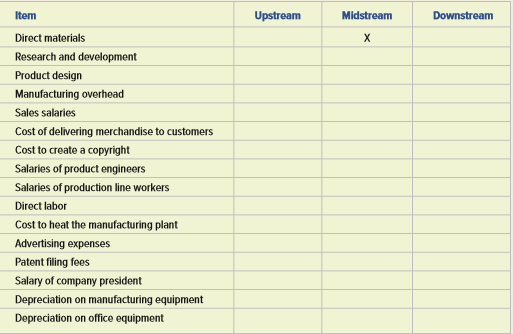 Item Upstream Midstream Downstream Direct materials X Research and development Product design Manufacturing overhead Sales salaries Cost of delivering merchandise to customers Cost to create a copyright Salaries of product engineers Salaries of production line workers Direct labor Cost to heat the manufacturing plant Advertising expenses Patent filing fees Salary of company president Depreciation on manufacturing equipment Depreciation on office equipment
