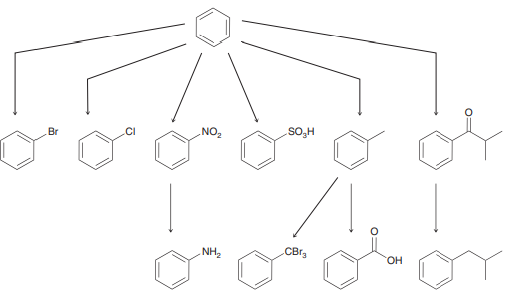 > Identify reagents that can be used to convert benzene into each of the following compounds: a. Chlorobenzene b. Nitrobenzene c. Bromobenzene d. Ethylbenzene e. Propylbenzene f. Isopropylbenzene g. Aniline (aminobenzene) h. Benzoic acid i. Toluen